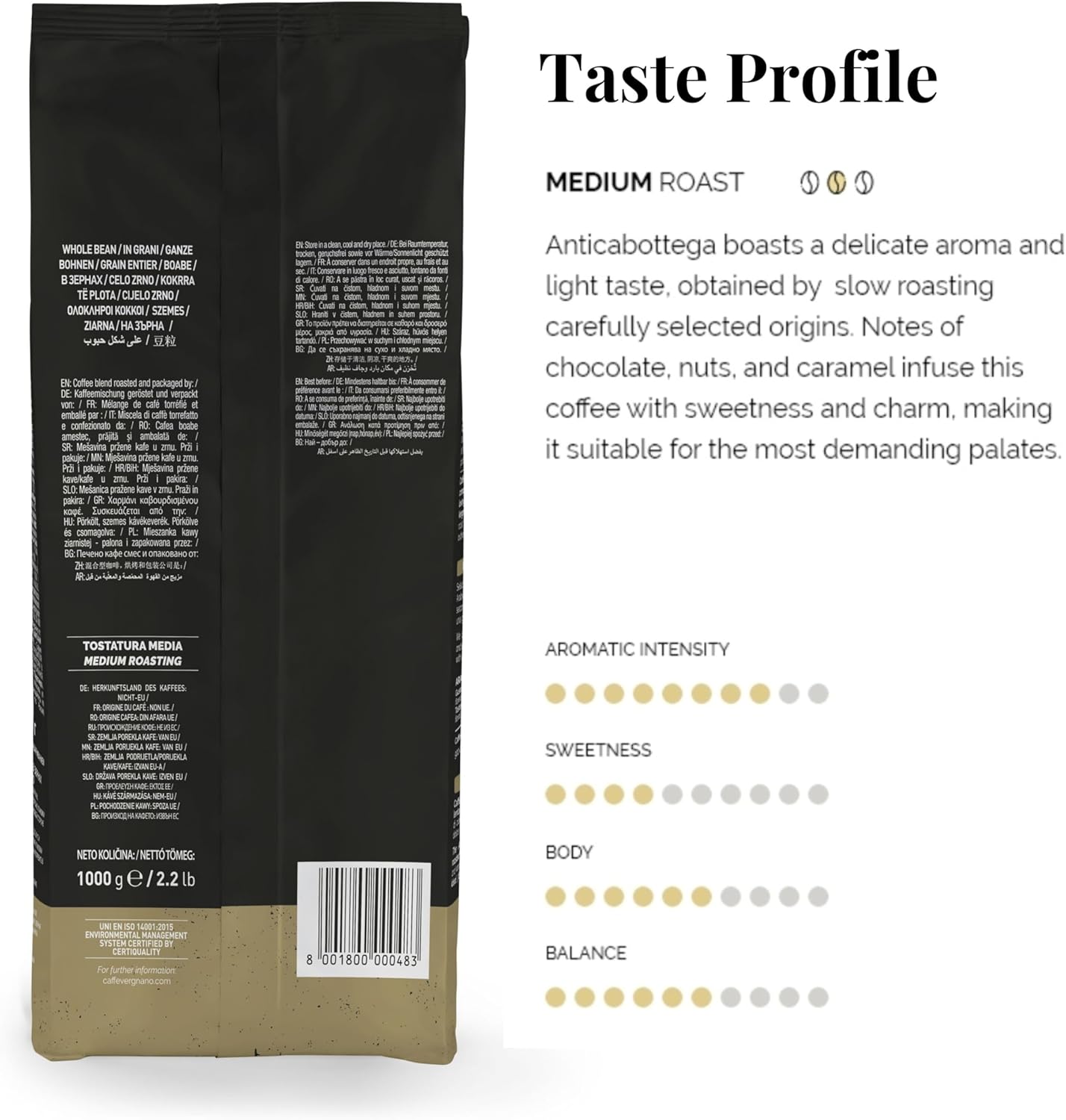 The Anticabottega blend is a delicate coffee, born from a slow roasting that gives a light taste. Hints and aromas of chocolate, fruit and vanilla make this coffee sweet and pleasant, suitable for the most sensitive palates.