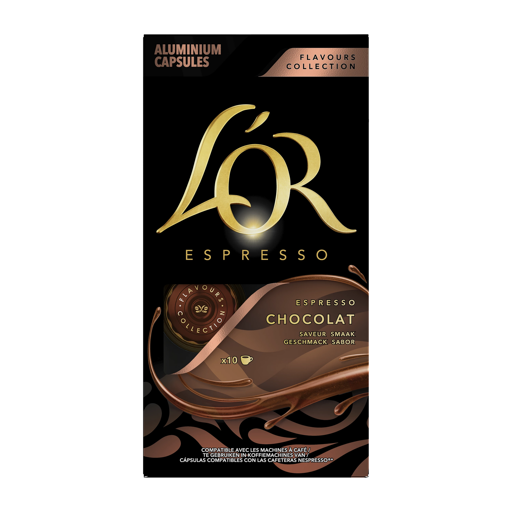 Discover L'Or Espresso chocolate capsules for Nespresso* Original capsule machines. Thanks to these 100% compatible capsules, enjoy an espresso with complex notes reminiscent of dark chocolate. A creamy, rounded and indulgent coffee that is well worth discovering, thanks to the 10-capsule format, perfect for getting started! Packaging: box of 10 capsules.