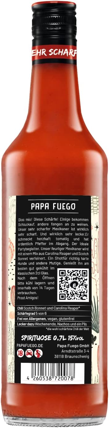 ๐Ÿ… NATURAL โ€“ Papa Fuego's Mexi is a very hot liquor free from artificial colors and flavor enhancers. It is also gluten-free and vegan.