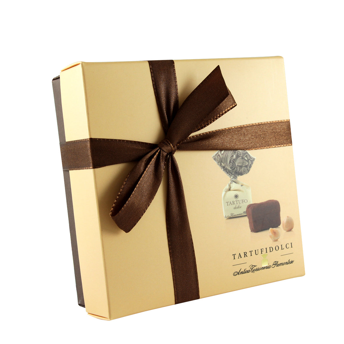 Sons of our land we wanted to enhance one of its best fruits: the Hazelnut. The mixture of our hazelnuts with the finest chocolate creates a taste with a rare balance able to make our Sweet Truffle one of the excellences of the made in Italy. Our gorgeous case, which represents the colour of our land, of our hazelnuts and tradition, exhalts the taste, closed by an extreme elegant ribbon. A Sweet Truffle and a case not to be lost!